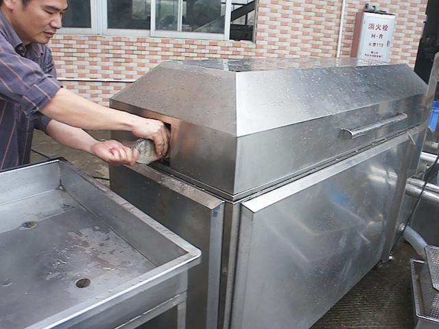 機內有高壓噴淋系統(tǒng),去除魚鱗,沖走內臟。