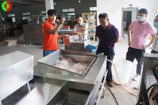 佛山某肉食品加工配送中心客戶一行人親臨我司測試訂購洗排骨機(jī)等設(shè)備!