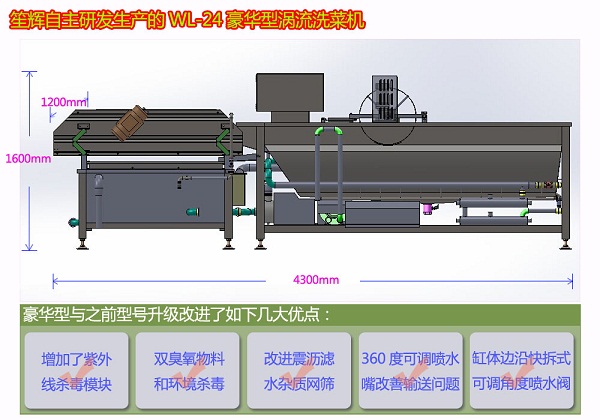 - 產品優勢: 渦流洗菜機它適合葉菜類,根莖類和腌制蔬果清洗。如:白菜,生菜,菠菜,腌制過的蘿卜,大頭菜等。本廠生產的豪華型渦流式洗菜機整個清洗系統由清洗主缸體、震動輸送機兩大部分組成。 此豪華型洗菜機的特點: 1.設備質量可靠,用料考究,單位產量高。 2.自動化程度高,安裝操作簡單易懂。 3.功能設計合理,人性化布局,使保養清洗變得方便快。
